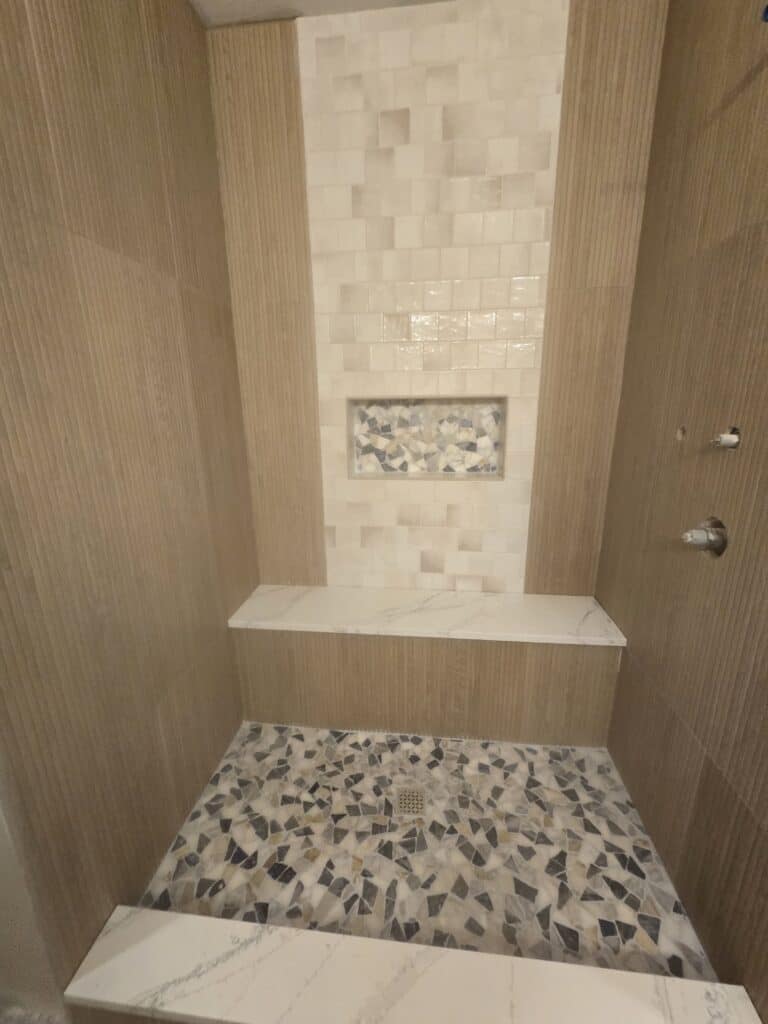- Completed tile work and finished the curb shower, including the shower niche and a quartz shower bench.